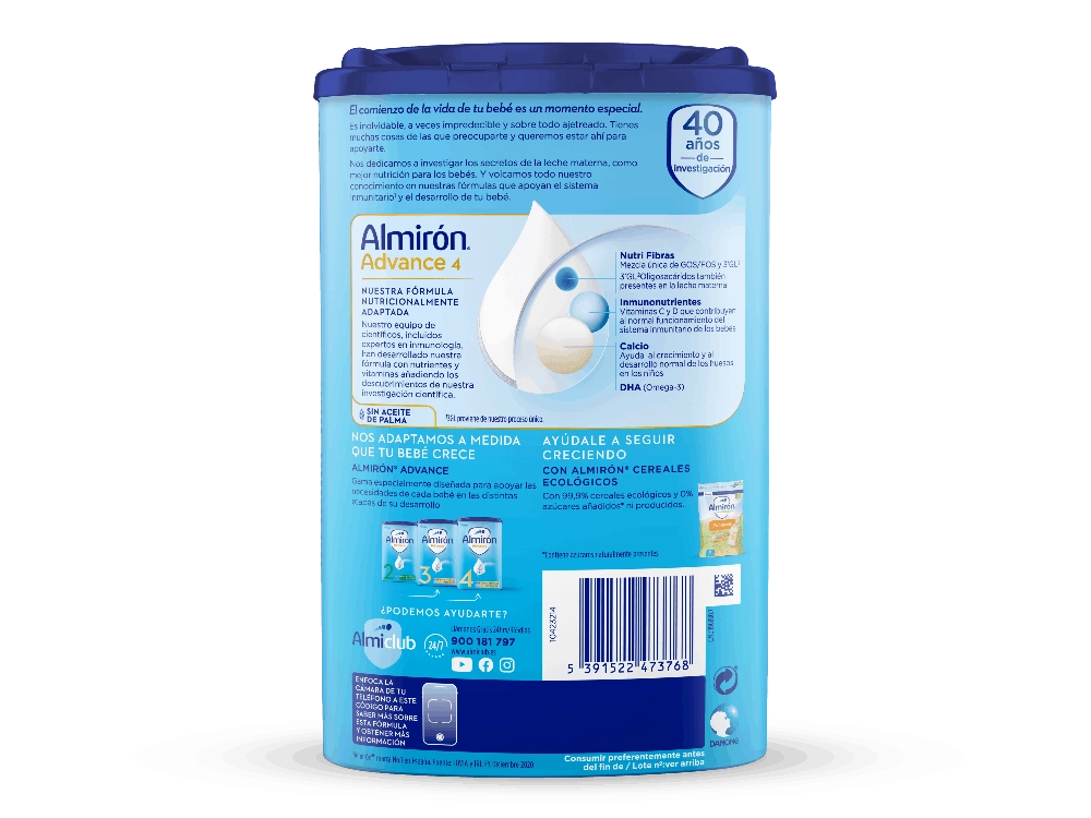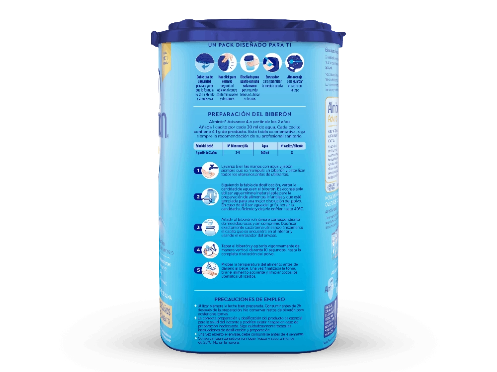 - Contiene NutriFibras GOS/FOS y HMO 3´GL que simulan la estructura de oligosacáridos presentes en la leche materna.