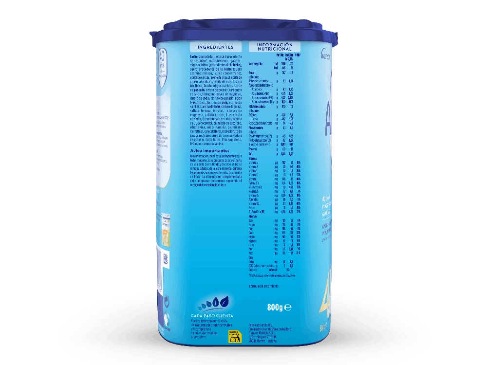 Leche desnatada, lactosa (procedente de la leche), maltodextrina, galacto oligosacáridos (procedentes de la leche), suero procedente de la leche (suero desmineralizado, suero concentrado), aceite de cánola, aceite de girasol, aceite de girasol alto oleico, aceite de coco, fosfato tricálcico, fructo-oligosacáridos,aceite de pescado, citrato de potasio, carbonato de calcio, hidrogenofosfato de magnesio, citrato de sodio, cloruro de potasio, ácido L-ascórbico, lecitina de soja, aroma de vainillina, aroma de leche, cloruro de colina, sulfato ferroso, inositol, cloruro de magnesio, sulfato de zinc, L-ascorbato de sodio, D-pantotenato de calcio, acetato de DL-α-tocoferol, palmitato de ascorbilo, riboflavina, nicotinamida, palmitato de retinol, colecalciferol, hidrocloruro de piridoxina, hidrocloruro de tiamina, yoduro de potasio, ácido fólico, fitomenadiona, D-Biotina, cianocobalamina.