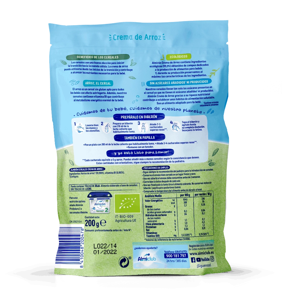 - Contiene un 99,9% de arroz ecológico obtenidos de campos dedicados a la producción de alimentos para bebés.