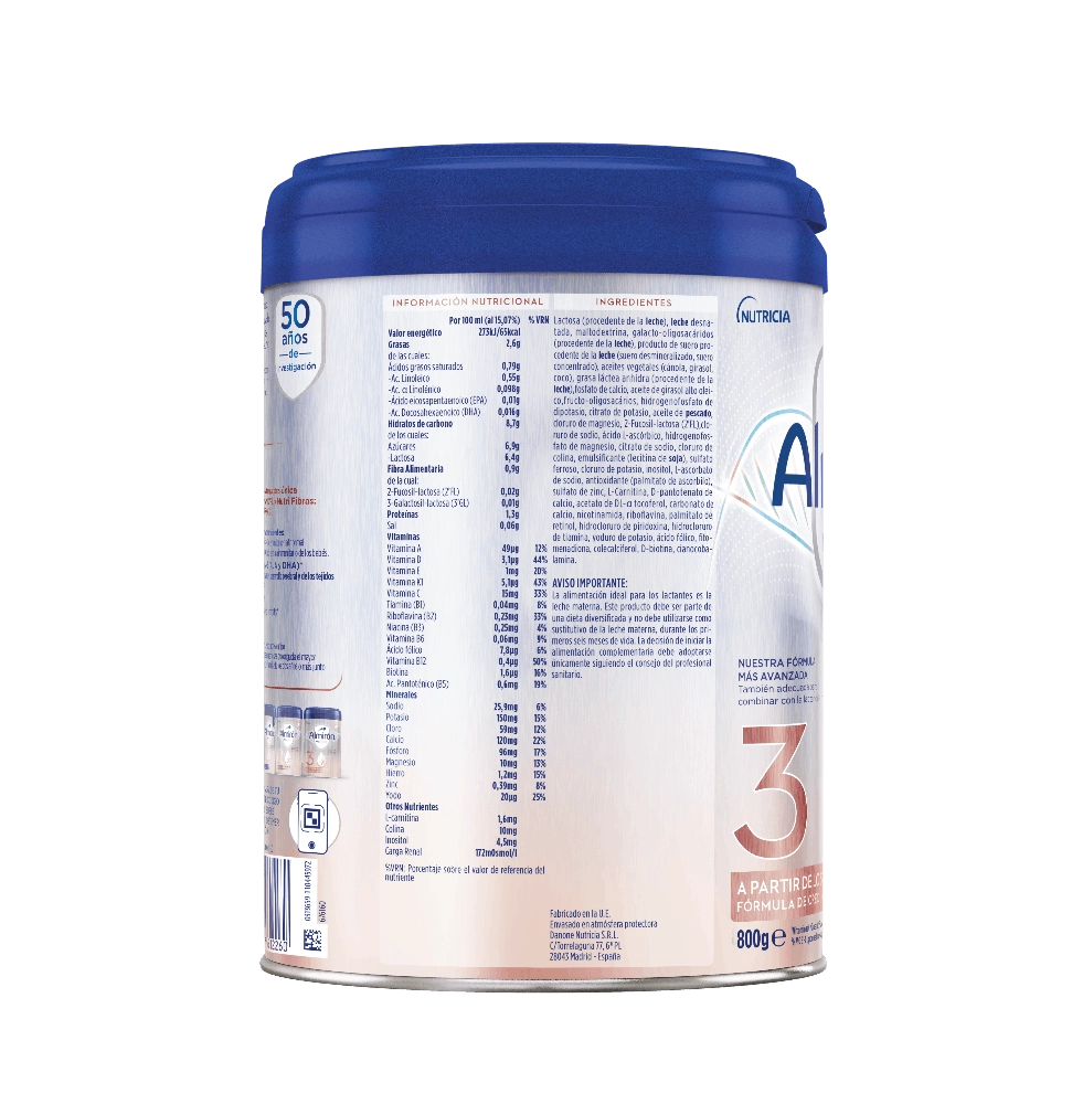 Lactosa (procedente de la leche), leche desnatada, suero desmineralizado (procedente de la leche), aceites vegetales (girasol, soja, coco, cánola), grasa láctea anhidra (procedente de la leche), galacto-oligosacáridos (procedente de la leche), suero concentrado (procedente de la leche), fructo-oligosacáridos, fosfato de calcio, aceite de pescado, seroproteína (procedente de la leche), 2-Fucosil-lactosa (2’FL), cloruro de potasio, citrato de potasio, aceite de Mortierella alpina, cloruro de colina, citrato de sodio, ácido L-ascórbico, hidrogenofosfato de magnesio, emulsificante (lecitina de soja), cloruro de sodio, cloruro de magnesio, taurina, inositol, sulfato ferroso, carbonato de calcio, L-Triptófano, L-ascorbato de sodio, L-Carnitina, sulfato de zinc, citidina 5′-monofosfato, sal sódica uridina 5′-monofosfato, antioxidante (palmitato de ascorbilo), adenosina 5′-monofosfato, sal sódica inosina 5′-monofosfato, acetato de DL-α tocoferol, nicotinamida, D-pantotenato de calcio, sal sódica guanosina 5′-monofosfato, sulfato de cobre, palmitato de retinol, riboflavina, hidrocloruro de tiamina, hidrocloruro de piridoxina, yoduro de potasio, ácido fólico, sulfato de manganeso, selenito de sodio, fitomenadiona, colecalciferol, D-biotina, acetato de retinol, cianocobalamina.